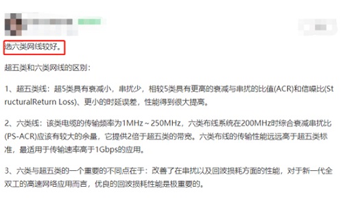 网友一:他说选超六类网线比较好,之后就分别说明了超五类网线和超六类网线的区别。